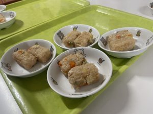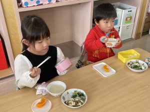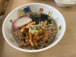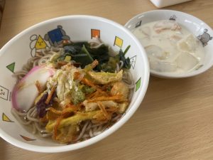 今日の給食メニュー『年越しそば・えびと冬野菜のかき揚げ・フルーツヨーグルト』でした。