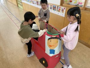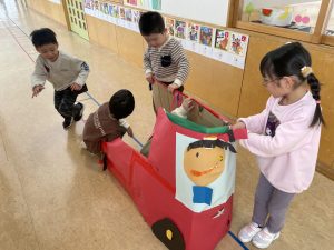 松組(5歳児)は、みんなで作った消防車を最後にもう一度、みんなであそびました。