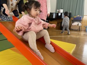楓1組(1歳児)と桃組(0歳児)は、すべり台などであそびました。