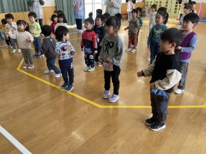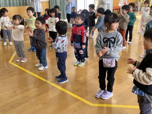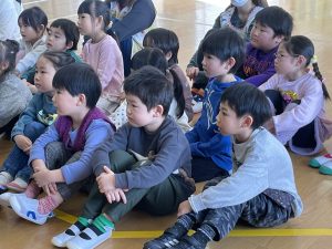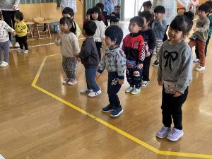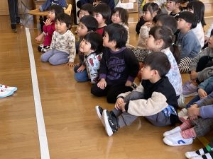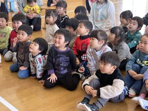 今日は2月3日節分。幼稚園では「まめまき集会」が行われました。