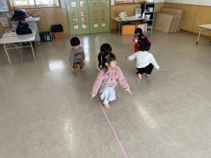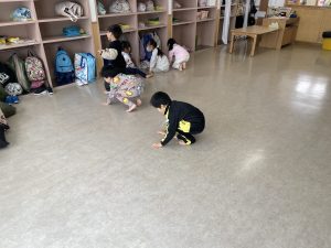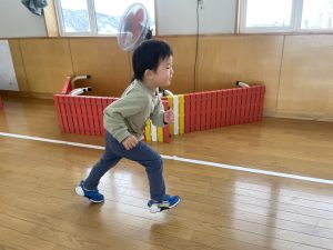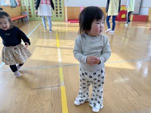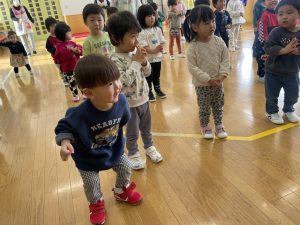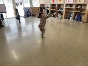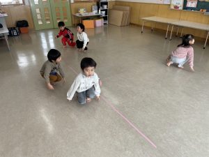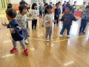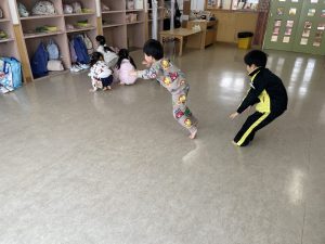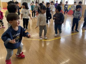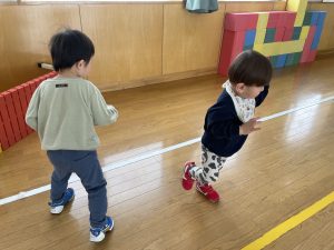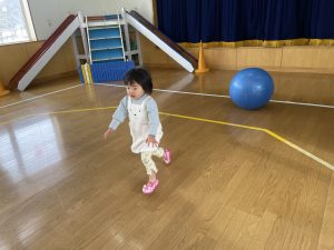 楓2・楓1・桃組(2・1・0歳児)は遊戯室や保育室であそびました。思いっきり走り回ったりして、たっぷりあそびました。