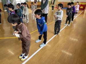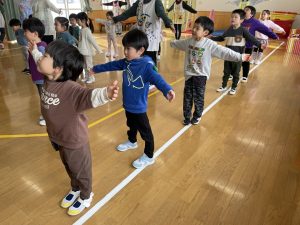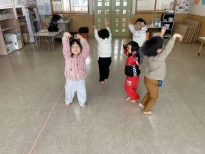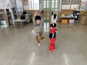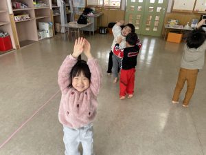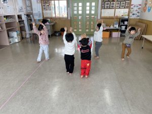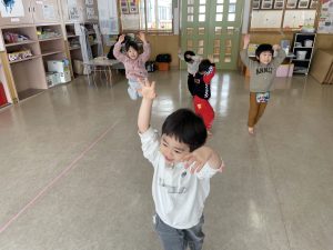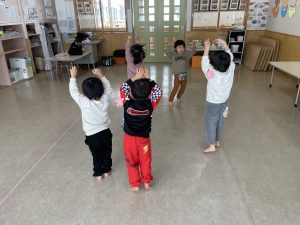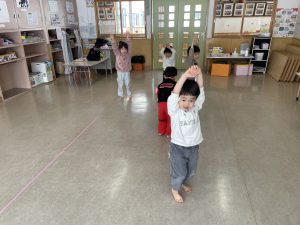 さて、朝会、絵本の読み聞かせの後、ラーメン体操。みんなこの体操が大好きですね。