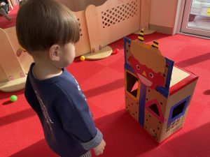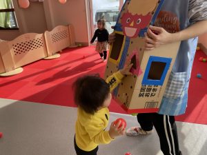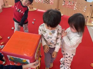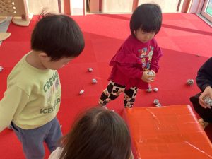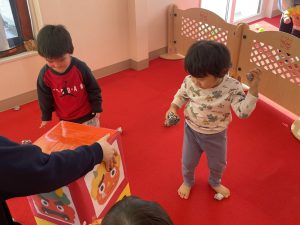 桃組(0歳児)も、お部屋で鬼的にボールを投げる練習をしましたが、少し、書いた鬼の絵が怖かったようです。また、段ボールの穴にボールを入れたり、坂にしてボールを転がしているうちに、