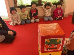 節分とはどういう日なのかというお話を聞いて、唄「まめまき」を元気よく歌い、紙芝居「おにとおひゃくしょうさん」を見て、鬼の嫌いなものをみんなで確認。