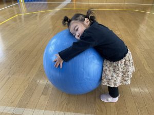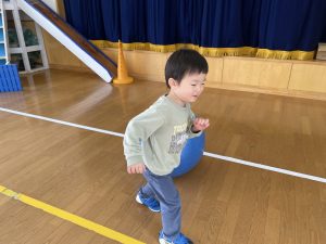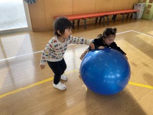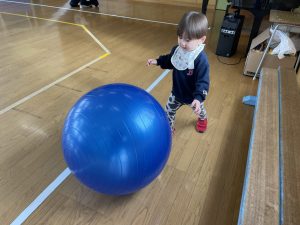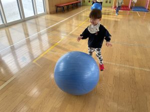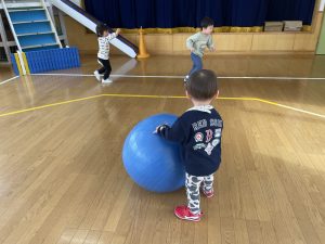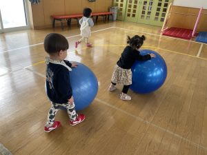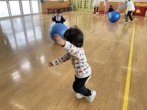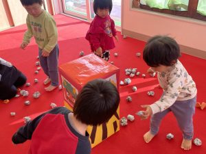 楓1組(1歳児)は、運動あそび。来週のまめまき集会に向けて、狙ったところにボールを投げる練習にもなりました。終わった後はみんなでお片付け。