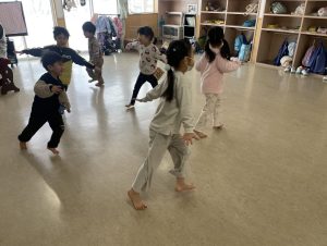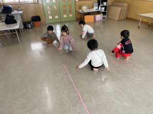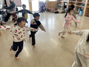松・竹・桜組(5・4・3歳児)はお外あそびの予定でしたが、気温が低かったため、急遽お部屋で「カルタ大会」。とても盛り上がりましたね。その後は、遊戯室で思いっきりあそびました。