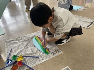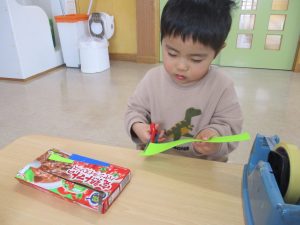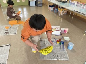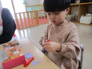 竹組(4歳児)は、来週のまめまき集会へ向けた製作。後半は遊戯室であそびました。