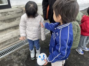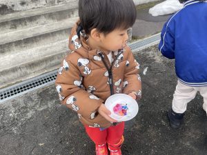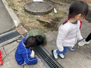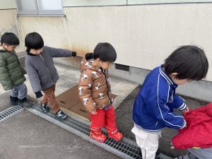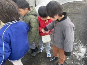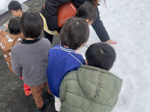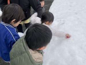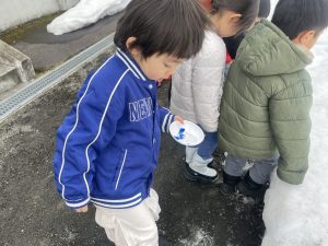 桜組(3歳児)は、以前行った雪山での実験道具が、雪が解けて現れてきたので回収。そして、氷がないか探し回ってみました。じっと観察していました。