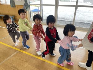 楓1組(1歳児)は、園内探検。みんなで繋がって、お兄さんお姉さんのお部屋にも遊びに行ってみました。