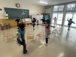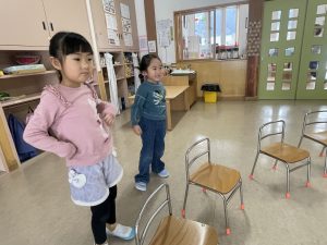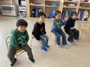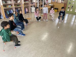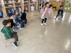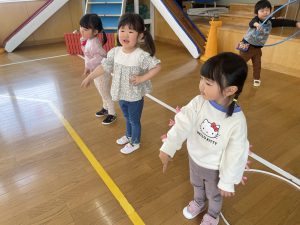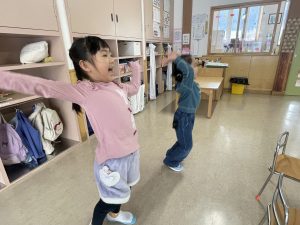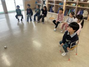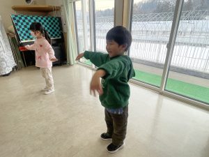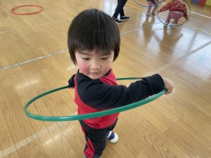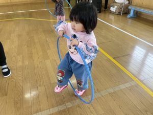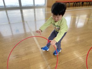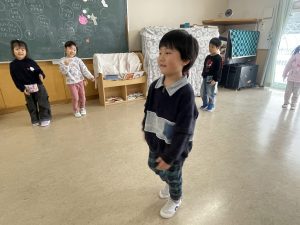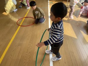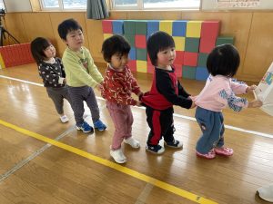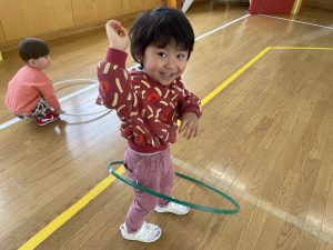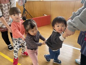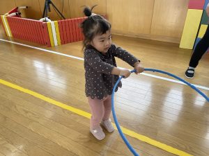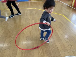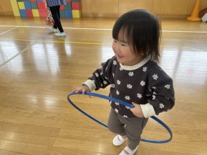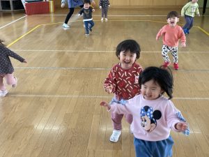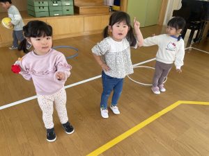 楓2組(2歳児)は、お部屋のあと、遊戯室へ。音楽に合わせて踊ったり、ボールあそびなどをしました。