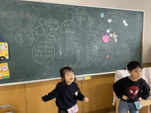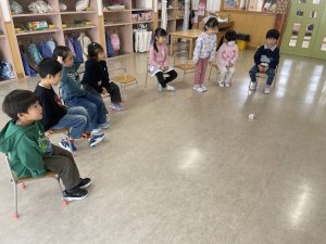 竹組(4歳児)は、すごろく! 自分たちの駒を作って、手作りサイコロでスタート。途中、みんなで体操を踊るところに当たりました。