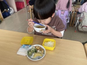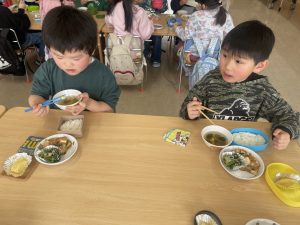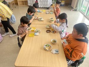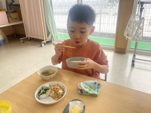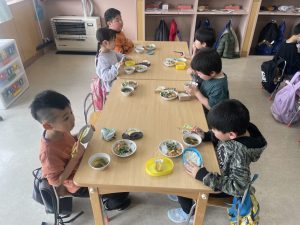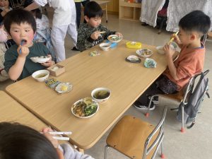 松組(5歳児)は、卒園式の練習も頑張っていますよ。今日は給食の様子をご覧ください。