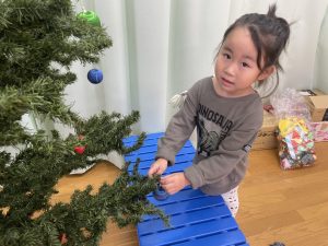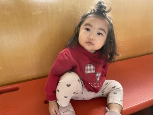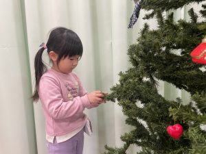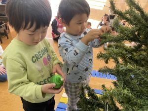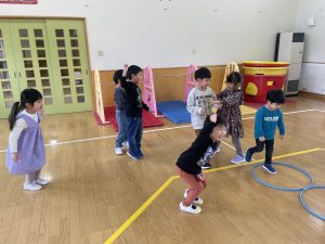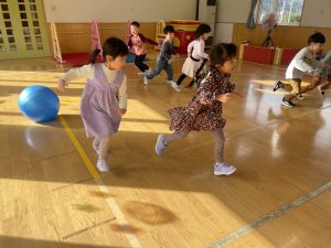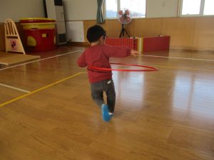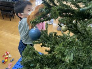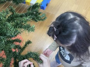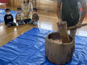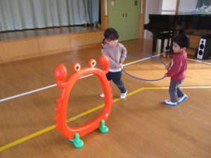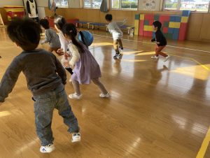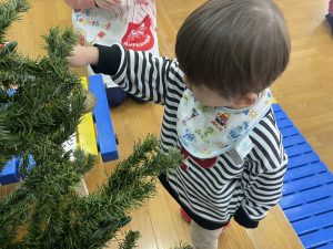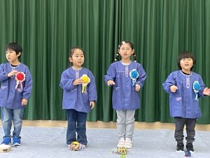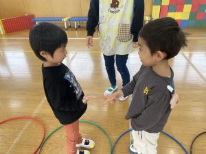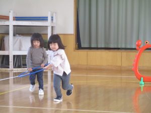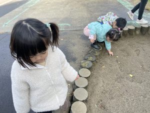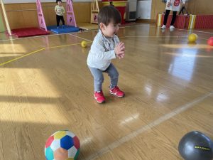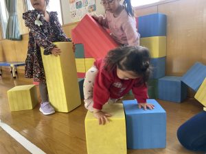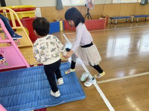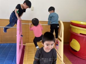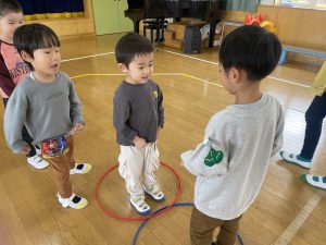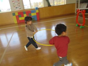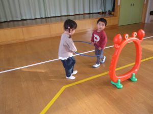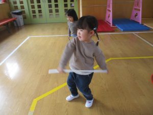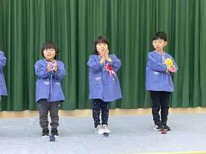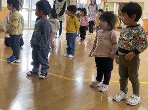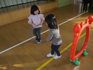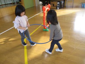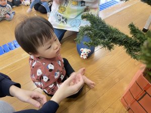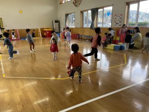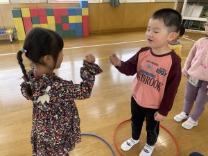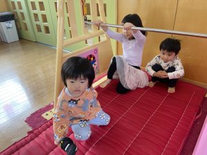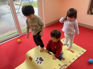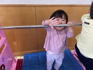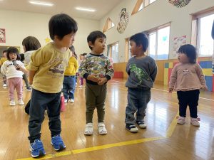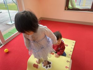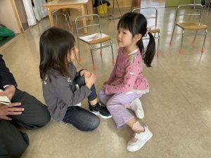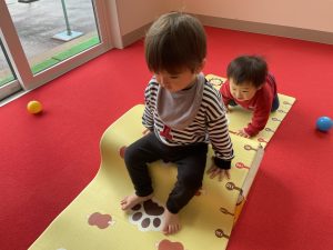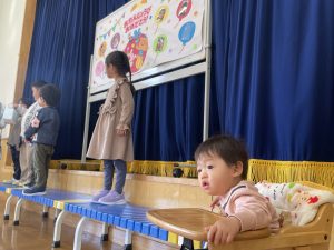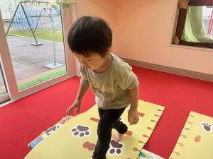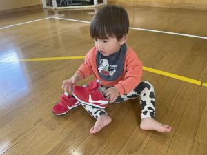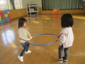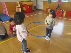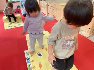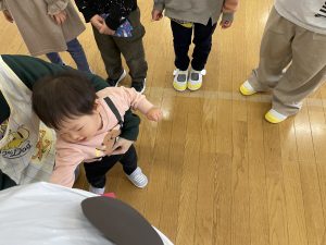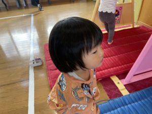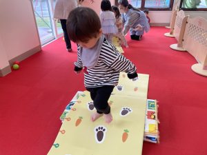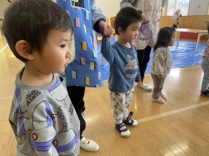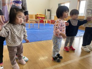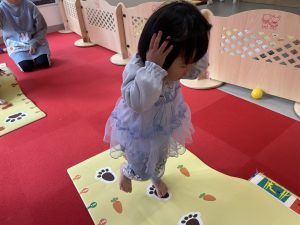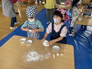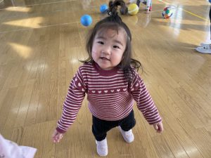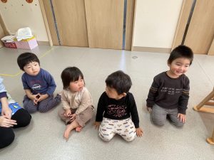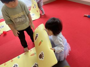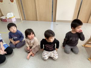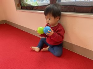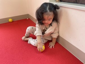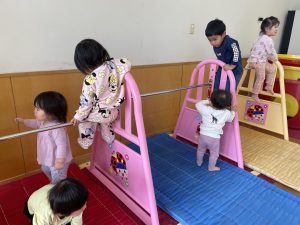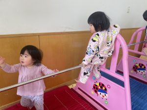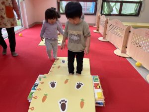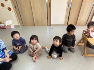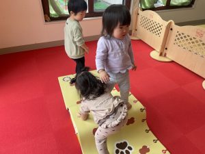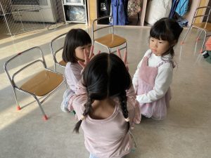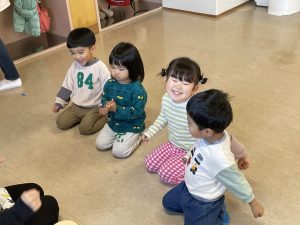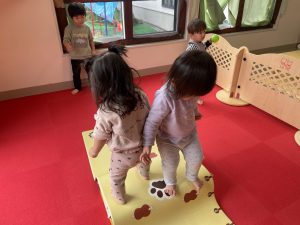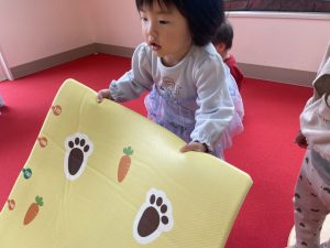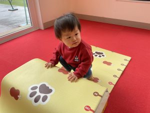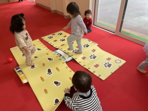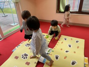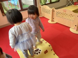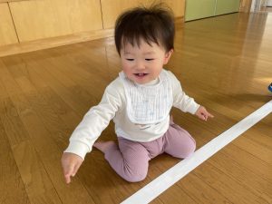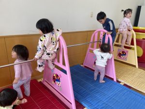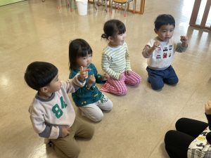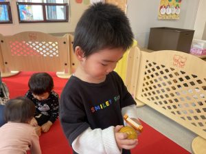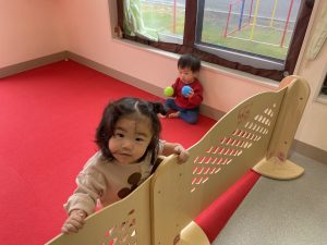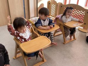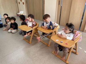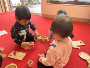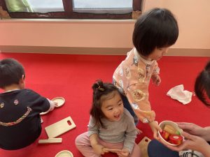 楓1組(1歳児)と桃組(0歳児)は、大好きなおままごとあそび。いろいろな会話が楽しめるようになってきましたね。