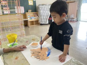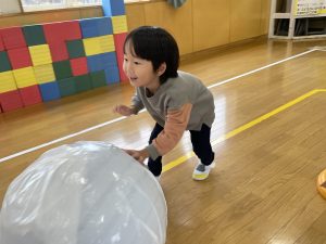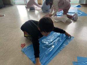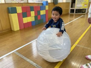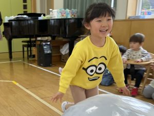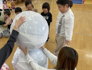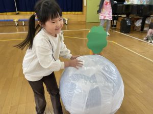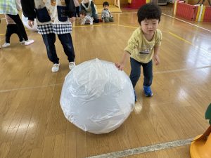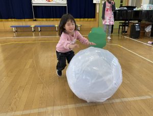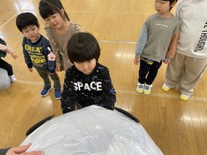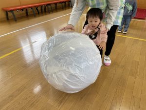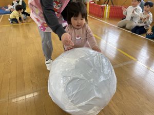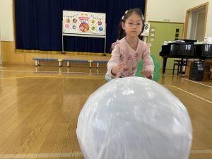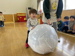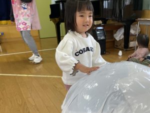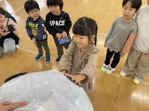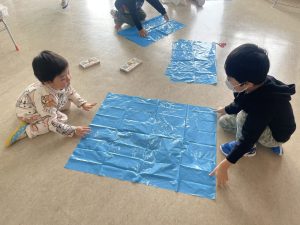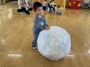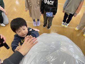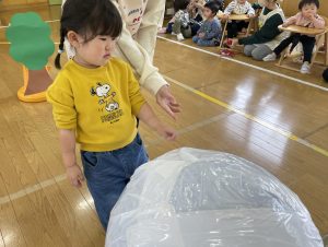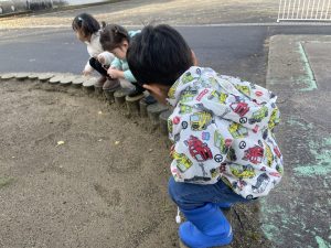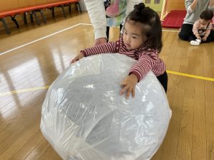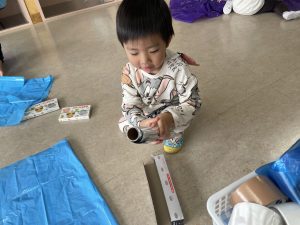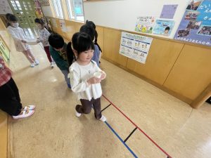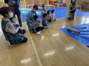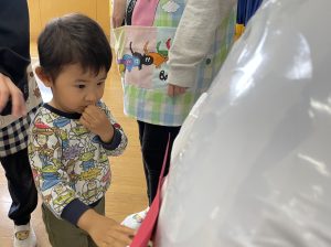 洗面器や紙コップ、風船などに水を入れて、お外へ。明日、どうなっているか楽しみですね。