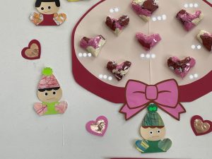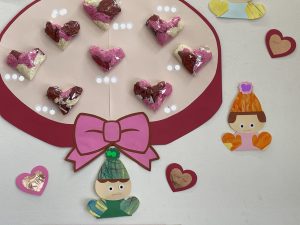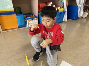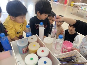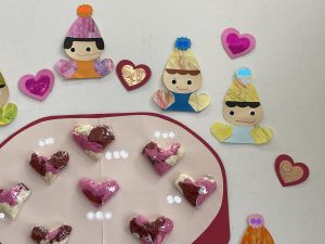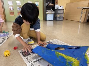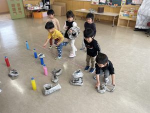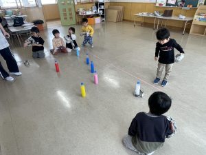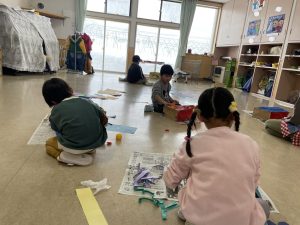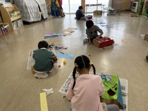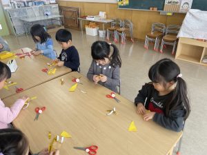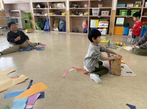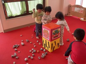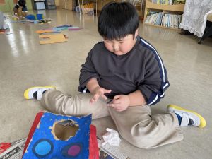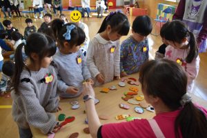 とても楽しそうに、手作りの豆を各自のマスに入れている子どもたち。