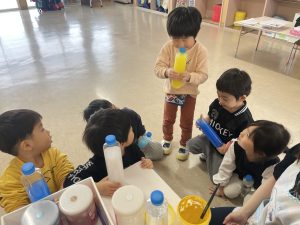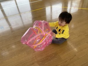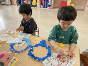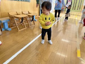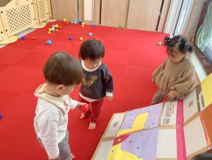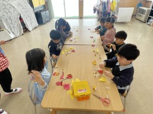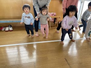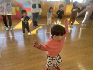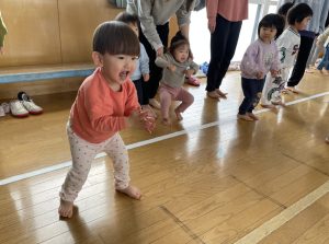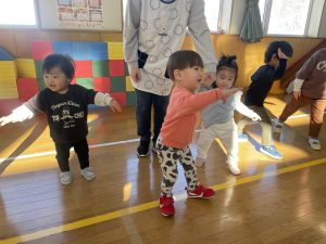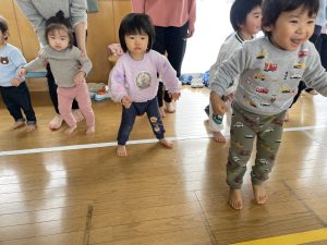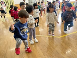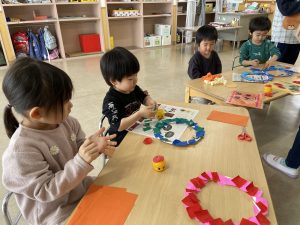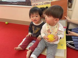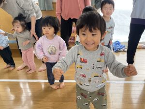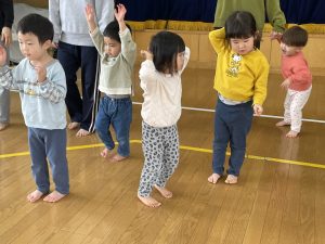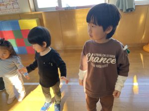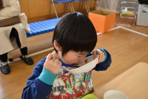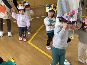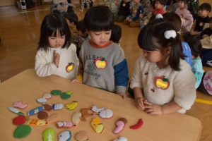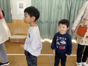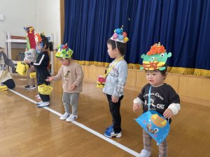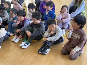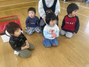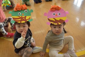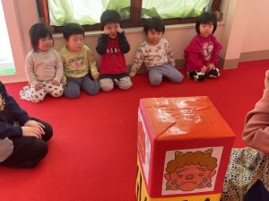 節分とはどういう日なのかというお話を聞いて、唄「まめまき」を元気よく歌い、紙芝居「おにとおひゃくしょうさん」を見て、鬼の嫌いなものをみんなで確認。