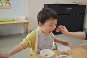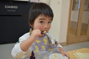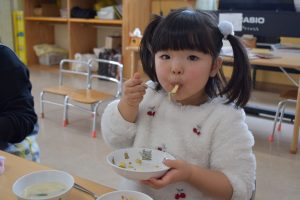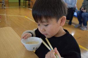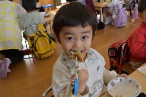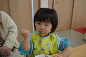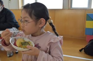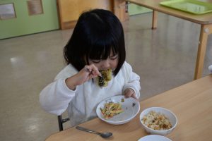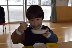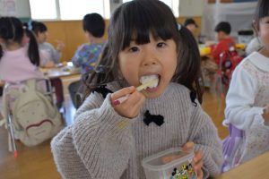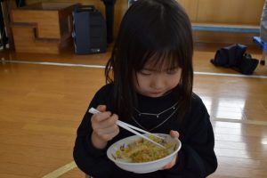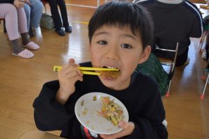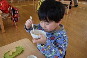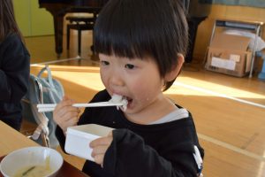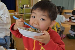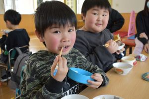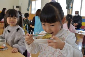 今日の給食メニューは『赤鬼焼きそば・節分汁・りんご』でした。手作りおやつは『恵方巻き』でした。みんな楽しくいただきました。
