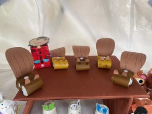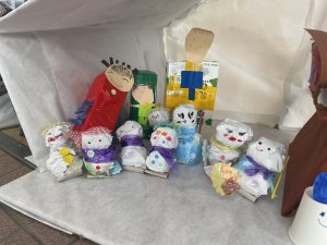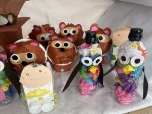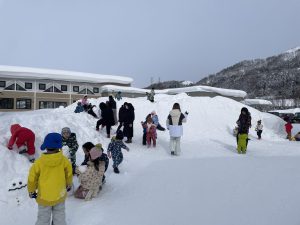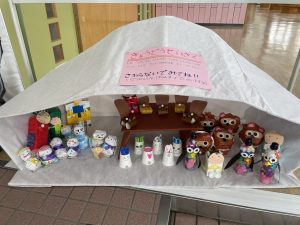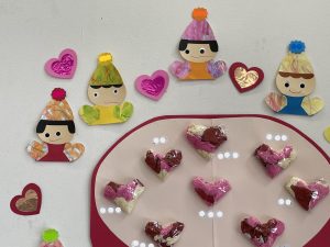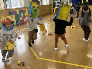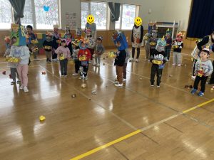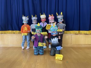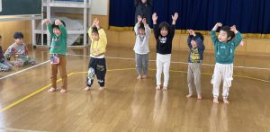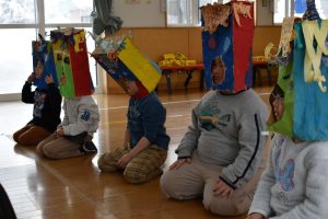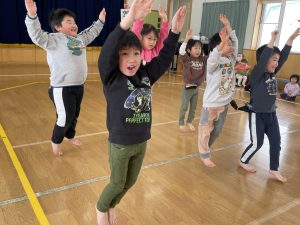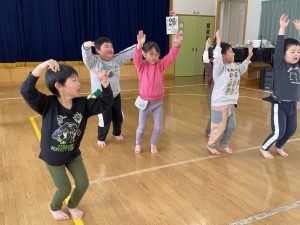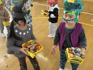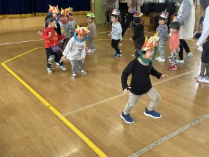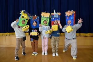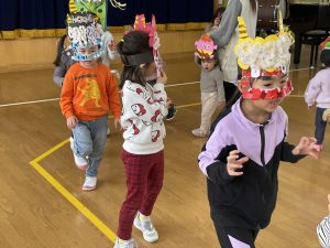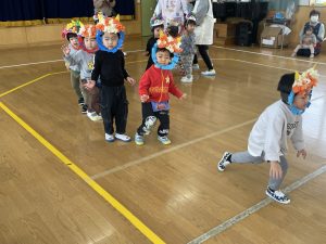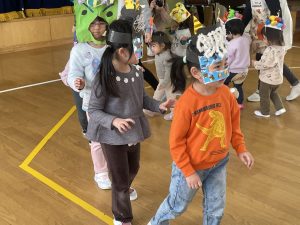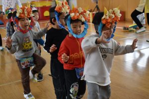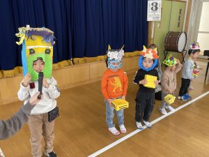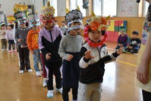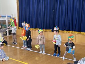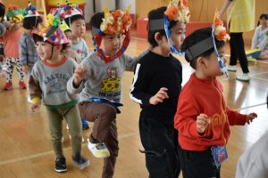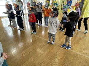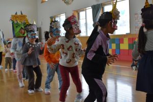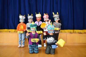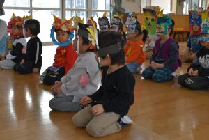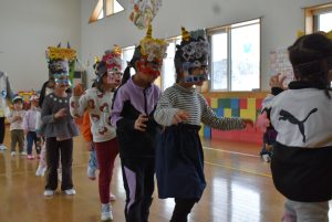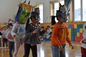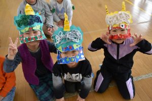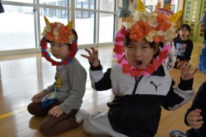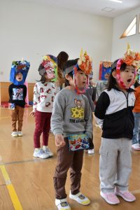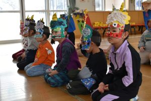 その後、クラス代表者が製作したお面とマスを紹介して、みんなで鬼の行進を元気よくしました。